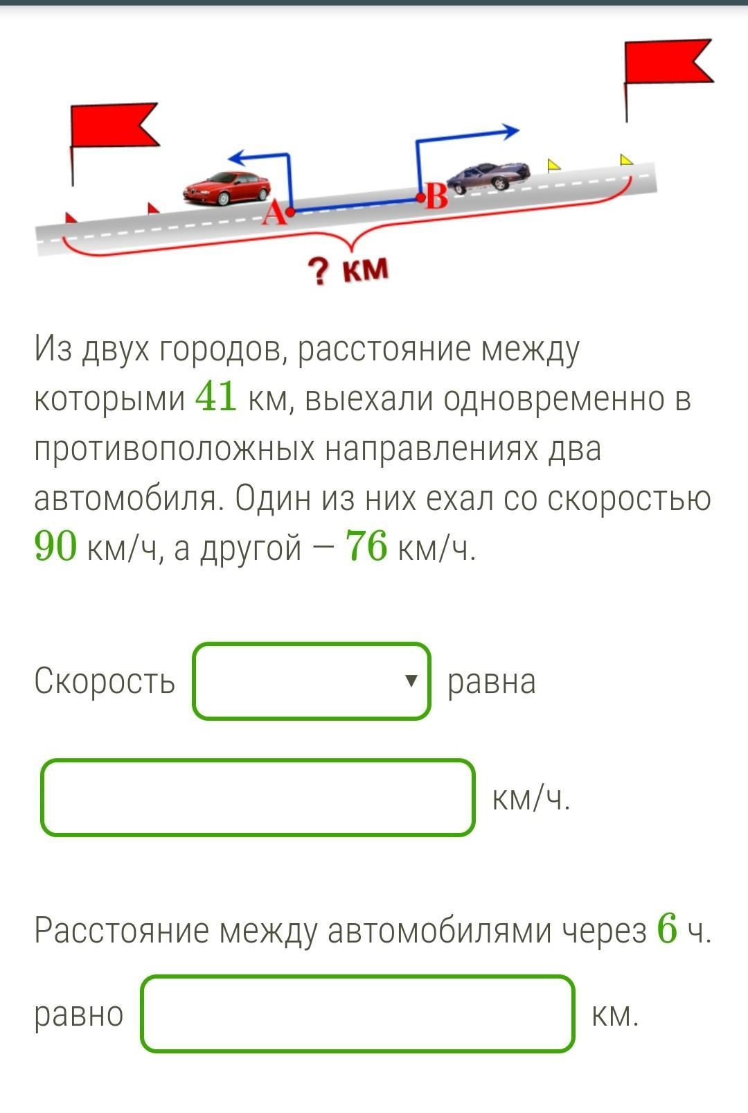 Из двух городов, расстояние между которыми 41 км, выехали одновременно в противоположных направлениях два автомобиля. Один из них ехал со скоростью 90 км/ч, а другой — 76 км/ч.