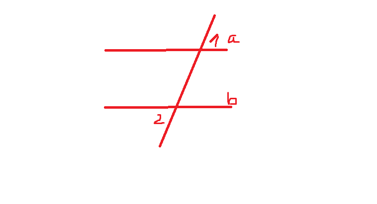 Угол 1 равен углу, который с ним вертикальный (напротив который) , то значит и этот угол будет 1. Теперь получается, что новый угол 1 и 2 равны. Они соответственные. Значит прямые параллельны