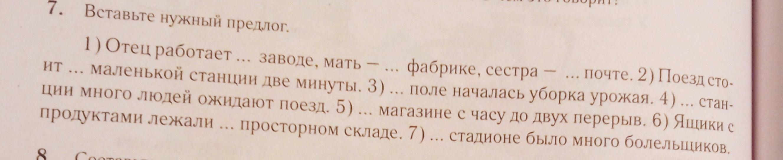 1)Отец работает в заводе,мать - в фабрике,сестра - в почте. 2)Поезд стоит в маленькой станции две минуты. 3)В поле началась уборка урожая. 4)В станции много людей ожидают поезд. 5) В магазине с часу до двух перерыв. 6)Ящики с продуктами лежали в просторном складе. 7)В стадионе было много болельщиклв