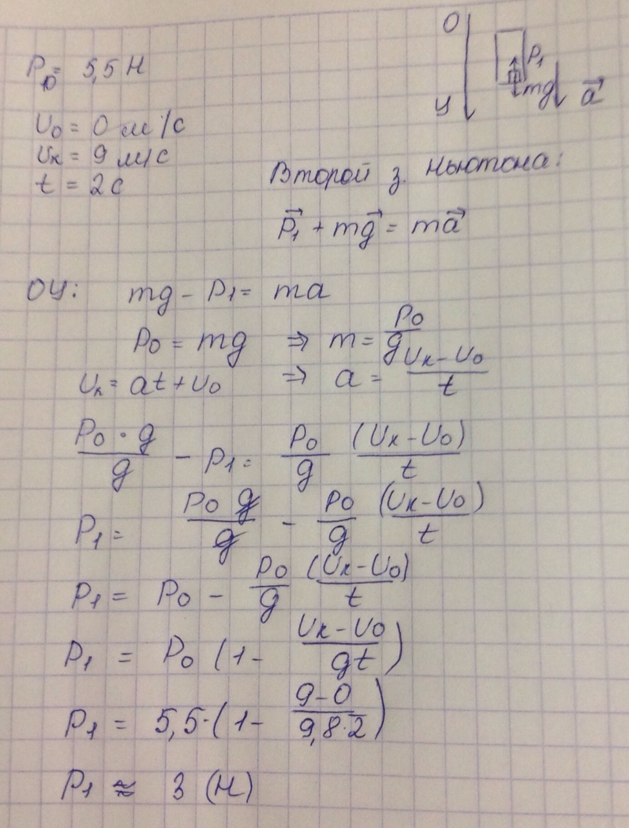 Вес тела в состоянии покоя 5,5Н. Найдите вес этого тела при вертикальном движении вниз, во время которого скорость вырастет от 0 к 9 м/с в течение 2с.