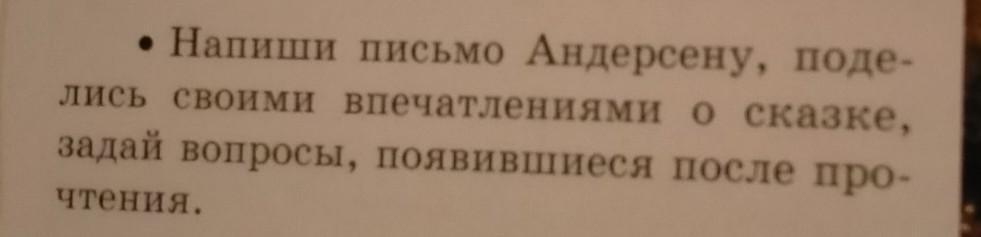 Я - школьник из 21-го века. Я пишу вам, чтобы выразить свое восхищение вашими произведениями. Вас знают во всем мире как автора прекрасных сказок. "Гадкий утенок", "Стойкий оловянный солдатик", "Снежная королева" "Дикие лебеди", "Новое платье короля", "Дюймовочка", "Огниво", "Русалочка", "Принцесса на горошине", "Оле-Лукойе", - все эти сказки читают во всем мире. Вы - датский писатель, а я живу в России, но ваши сказки не имеют национальности. Их перевели на множество языков, и дети всего мира знают, кто такая Дюймовочка или Снежная Королева - благодаря вам.