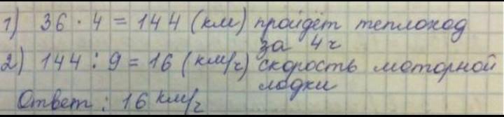 Теплоход проходит за 4 ч. такое же расстояние как и моторная лодка за 9ч Узнай скорость моторной лодки, если сезветно, что скорость теплохода 36ки/ч пожалуйста условие!!!!