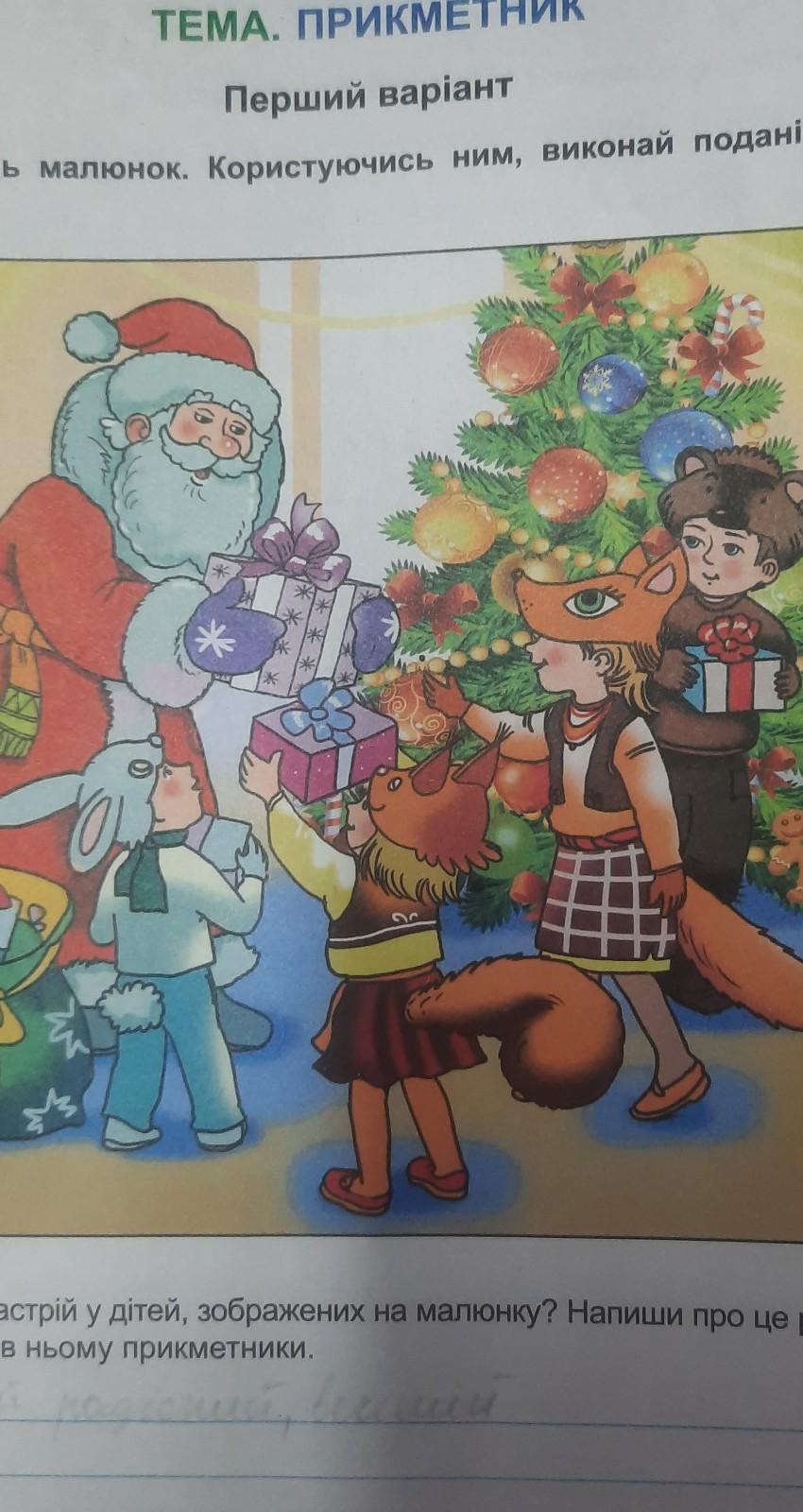 Який настрій у дітей,зображено на малюнку?Напиши про це речення. Підкресли в ньому прикметники.