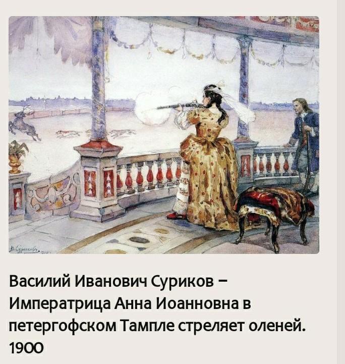 Сюжет картины «Императрица Анна Иоанновна в петергофском "Тампле" стреляет оленей»