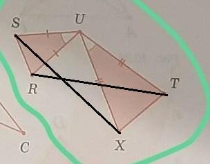 В тр-ках △URT и △UXS, <RUT=<TUX+RUX, a <SUX=<SUR+<RUX. Поскольку по данным рисунка <TUX=<SUR, то и <RUT=<SUX. А поскольку SU=RU, XU=TU, то △URT=△UXS по 1му признаку.