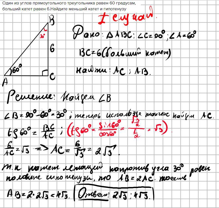 Один из углов прямоугольного треугольника равен 60 градусам, больший катет равен 6.Найдите меньший катет и гипотенузу