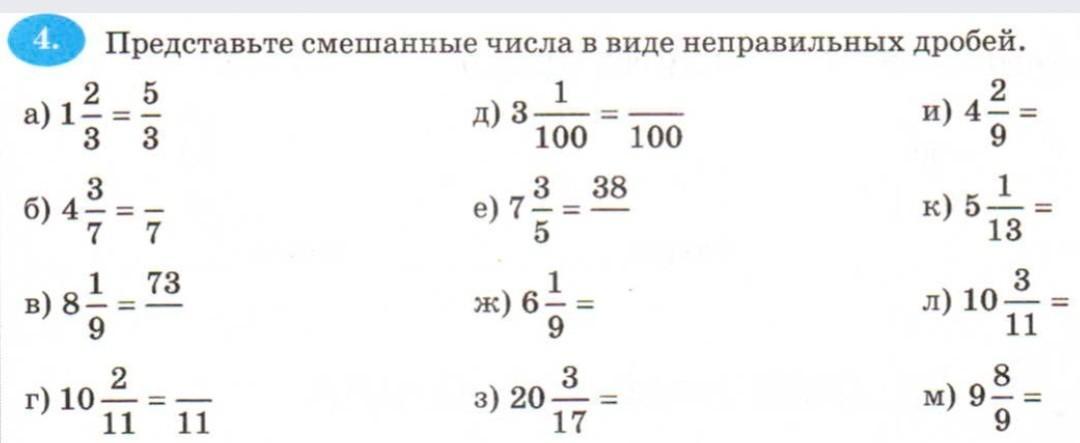 это же несложно. целое число умножаете на знаменатель и прибавляете его к числителю. полученное число пишите в числитель, знаменатель тот же.