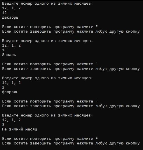 Console.WriteLine("Введите номер одного из зимних месяцев:\n12, 1, 2");