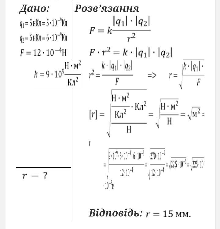 На якій відстані потрібно розташувати два точкових заряди 5 нКл і 6 нКл, щоб вони відштовхувалися один від одного із силою рівною 12*10 -4 Н? (-4 это степень)