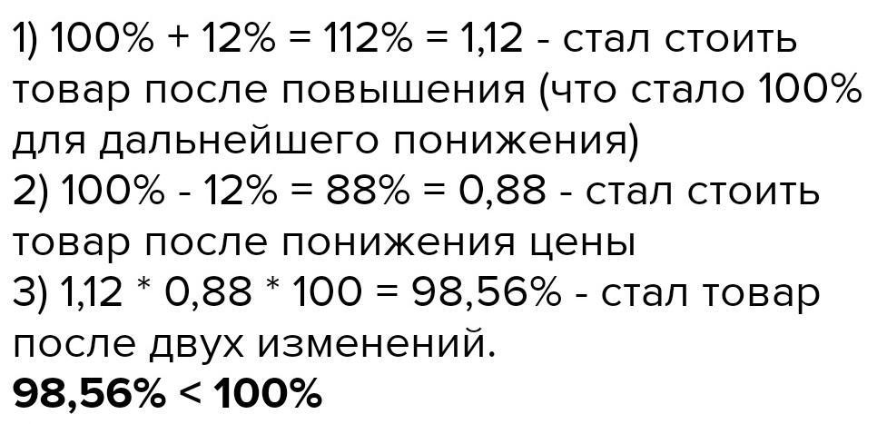 Первоначальная цена товара была 100 руб. Потом она повысилась на 12 % и через год понизилась на 12 % Сдал товар дешевле или дороже первоначальной цены?