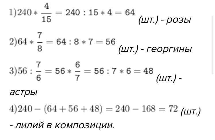 На выставке представлена композиция из 240 цветов: астр, георгин, роз и лилий. Георгины составляют 7/6 от количества астр и 7/8 от количества роз, а розы составляют 4/15 всех цветов. Сколько лилий в композиции?