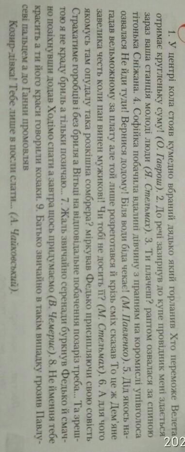 1. У центрі кола стояв кумедно вбраний дядько,який горланив-"Хто переможе Велета,отримає кругленьку суму!". 2.До речі,-зазирнув до купе провідник-мені здається,зараз ваша станція,молоді люди. 3.Ти плачеш? Раптом озвалася за спиною-тітонька Сніжана. 4.Софійка побачила вдалині дівчину з пранням на коромислі, упівголоса озвалася-"Не туди йди! Вернися додому! Біля води біда чекає!".5.Дід якось гадав вельможному за плату,але той лише розреготався й крізь сміх сказав-"То це ж,Дем'яне завелика честь,коли пан винен мужикові! Чи тобі не досить її?".6."А для чого якомусь там опудалу така розкішна сомбрера?"-міркував Федько,присипляючи свою совість-"Страхатиме горобців і без бриля,а Вітьці на відповідальне побачення позаріз треба... Та з рештою я не краду бриль,а тільки позичаю...". 7."Жаль звичайно серенади"-буркнув Федько й смачно позіхнувши додав-"Ходімо спати,а завтра щось придумаємо".8."Не ймення тебе красить,а ти його краси"- говорили козаки. 9.Батько,звичайно,в такім випадку грозив Павлусеві пальцем,а до Ганни промовляв: