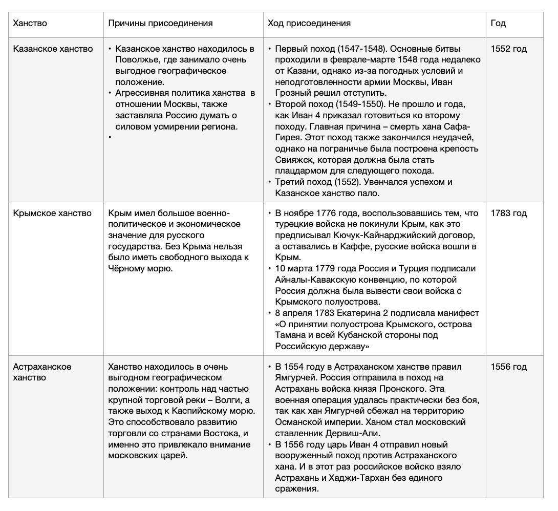 !ДАМ 60 БАЛЛОВ! таблица по ханствам в плане:Казанское ханство,Крымское ханство,Астраханское ханство.!Причины присоединения, ход присоединения. года.