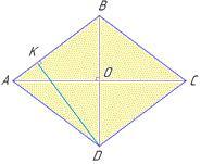 SABCD=AC*BD, з іншої сторони SABCD=AB•DK, де DK - h (висота ромба), Знайдемо висоту ромба: