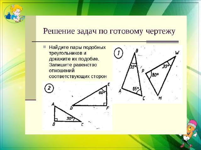 1. Треугольники BAC ~ WPM, т. к. угол W = углу B = 35°, угол C = углу M = 180° - 80° - 35° = 65°, угол A = углу P = 180° - 65° - 35° = 80°.