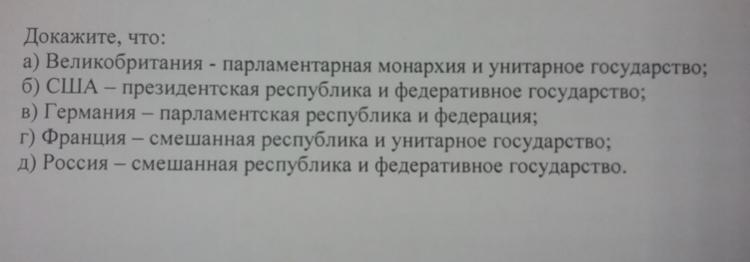 5) Россию относят к смешанным республикам, так как в Конституции создан баланс между исполнительной и законодательной властями. Так, например, Президент формирует правительство РФ, но выбранного им Председателя должна одобрить Государственная Дума.