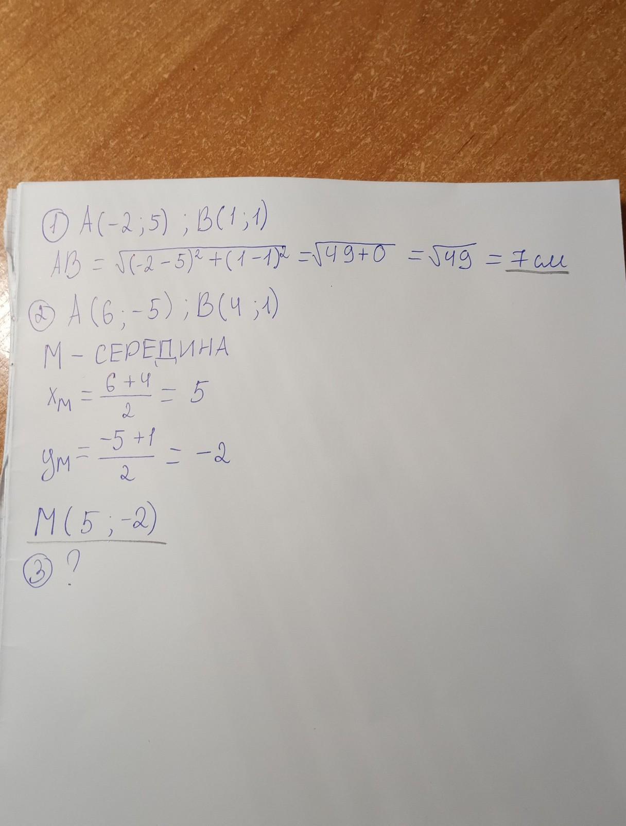 2- Знайти координати середина відрізка АВ, якщо А(6;-5), В(4;1).