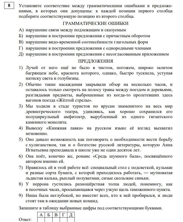 9) В) Ниша была неглубокой, но ВМЕЩАЛА всех, кто к ней пробирался, и люди СТОЯЛИ там в ожидании новых команд. 8) А) У перрона ГУСТИЛАСЬ разношёрстная толпа людей... 7) Г) 6) Б) ...романс..., ПОСВЯЩЁННЫЙ автором... 2) Д) ...поезда "ЖЁЛТАЯ СТРЕЛА". В ответах не очень уверена