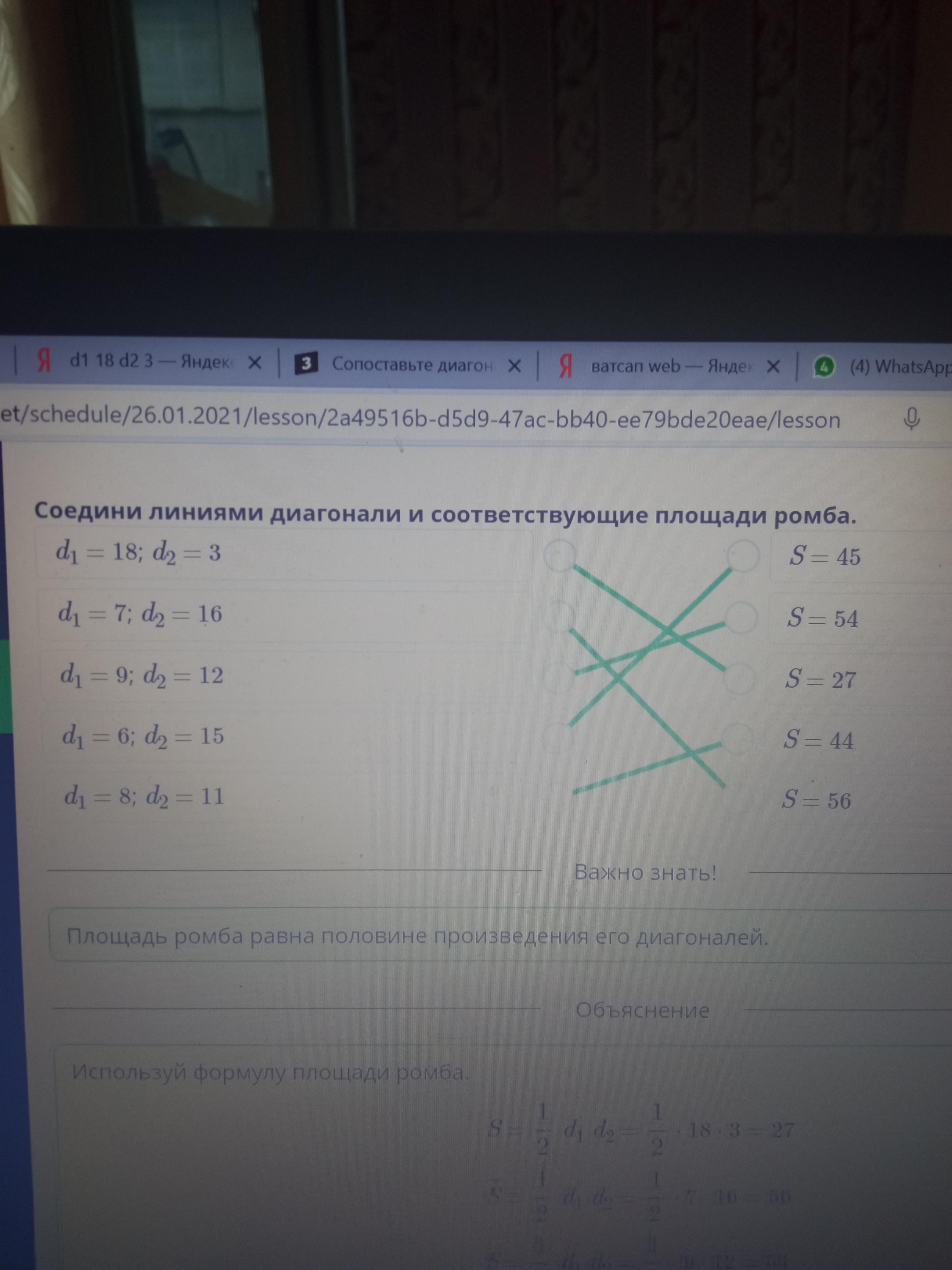 Сопоставьте диагонали ромба и площадь, соответствующую ему.