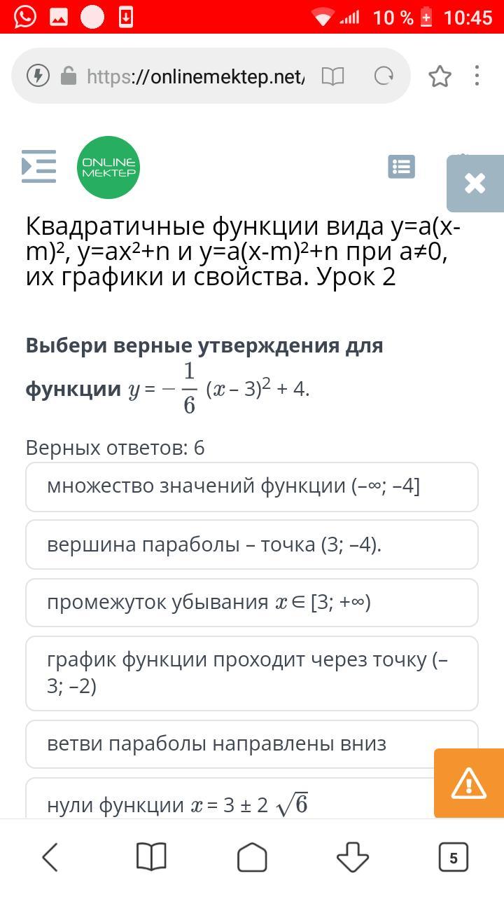 Верных ответов: 6 множество значений функции (–∞; –4] вершина параболы – точка (3; –4). промежуток убывания x ∈ [3; +∞) график функции проходит через точку (–3; –2) ветви параболы направлены вниз нули функции x = 3 ± 2 область определения функции (–∞; +∞) наибольшее значение функции y = 4 прямая x = 4 является осью симметрии графика функции промежуток возрастания x ∈ (–∞; 4]
