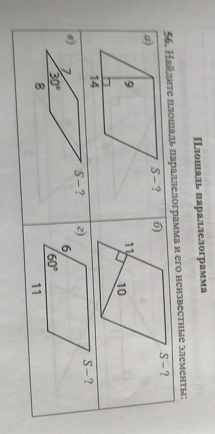 56. Найдите площадь параллелограмма и его неизвестные элементы: