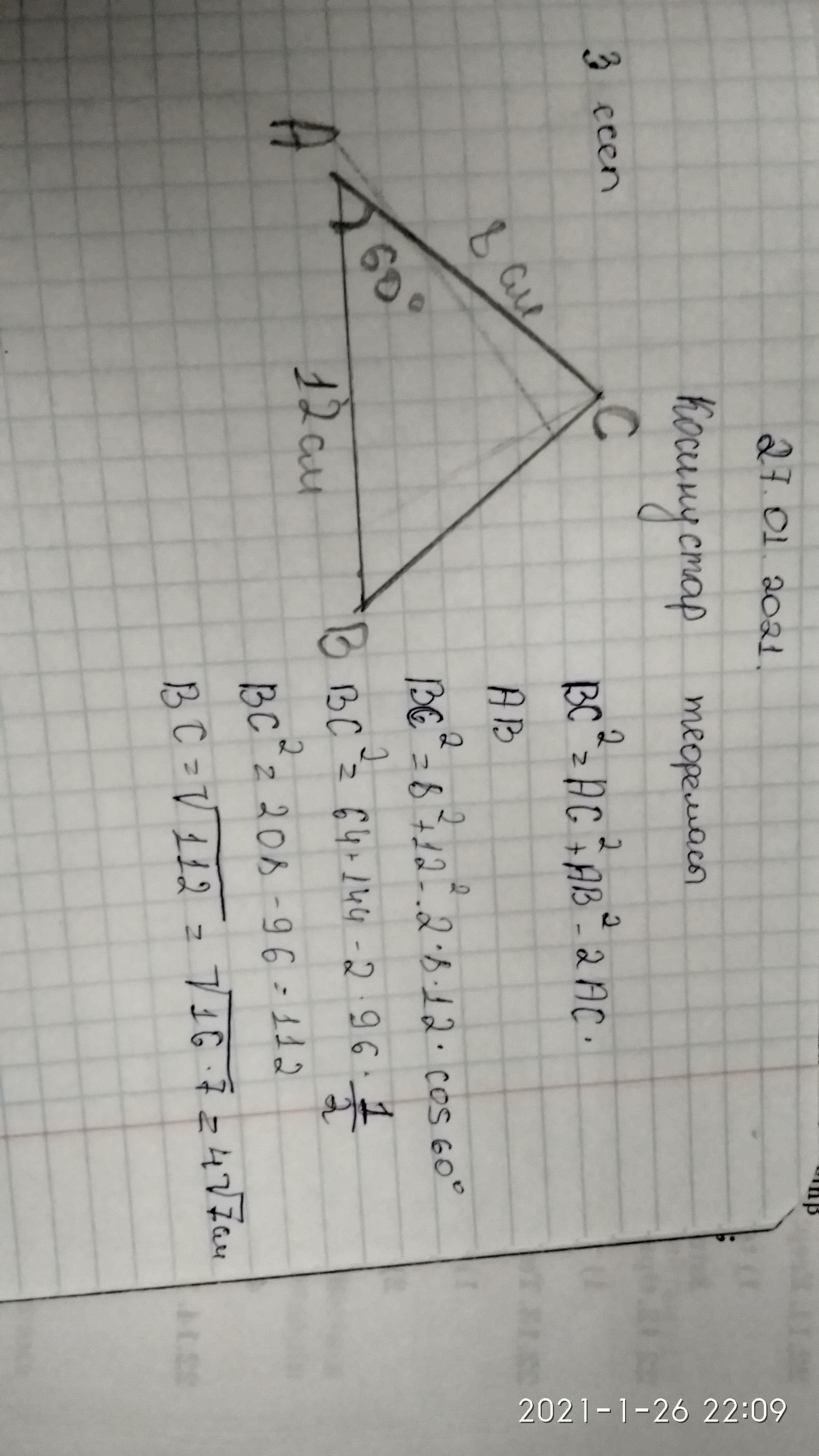ABC үшбұрышында AB =12,AC =8,Бұрыш A =60°.оның үшінші қабырғасын табыңдар