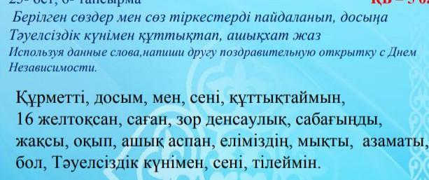 Құрметті досым мен сені 16 желтоксан күнімен құттықтаймын.Саған ашық аспан,зор денсаулық тілеймін.Сабағынды беспен жақсы оқып,еліміздің мықты азаматы бол.Тағы да Тәуелсіздік күнінмен!