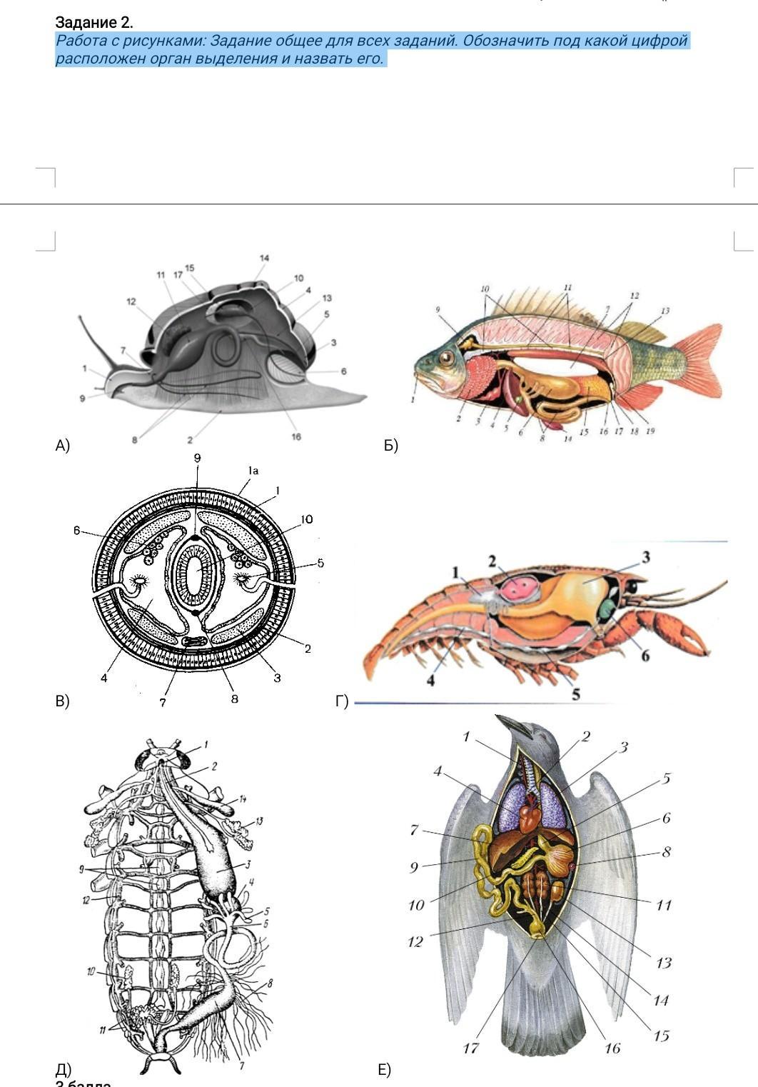 Работа с рисунками: Задание общее для всех заданий. Обозначить под какой цифрой расположен орган выделения и назвать его.