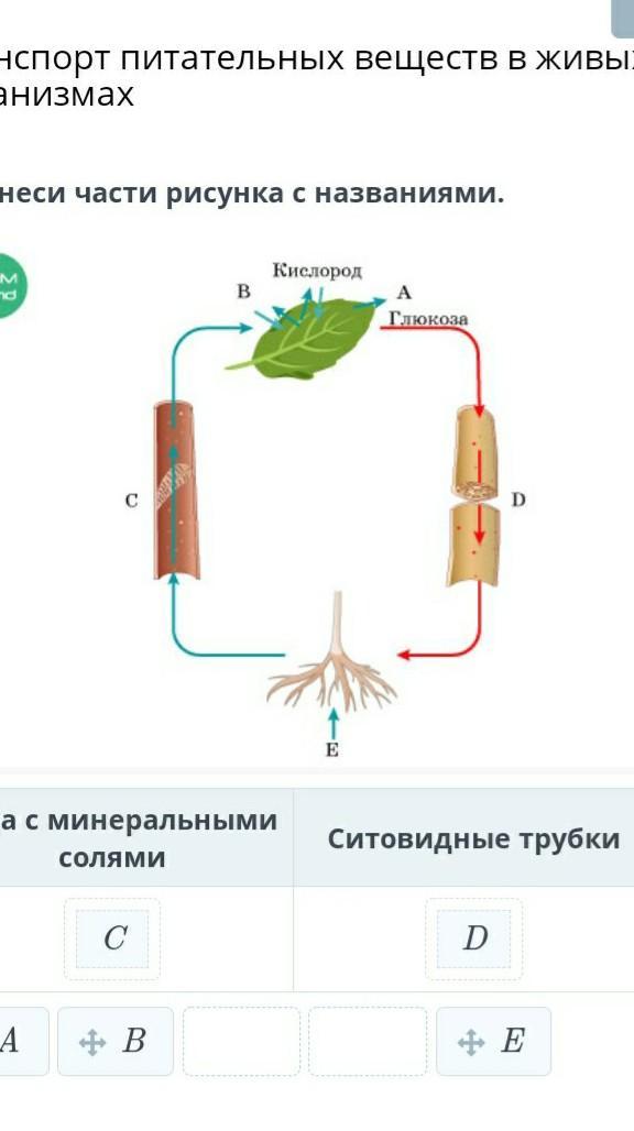 Через корни (Е) вода с минеральными веществами поступает в растение. По ксилеме (С) транспортируется в листья (В).Глюкоза образуется в листе (А), через ситовидные трубки (Д) транспортируется в корни и остальные части растений