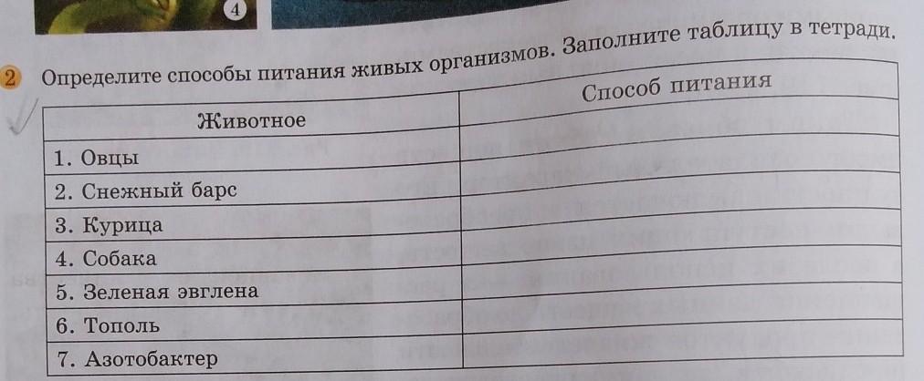 Определите способы питания живых организмов. Заполните таблицу в тетра