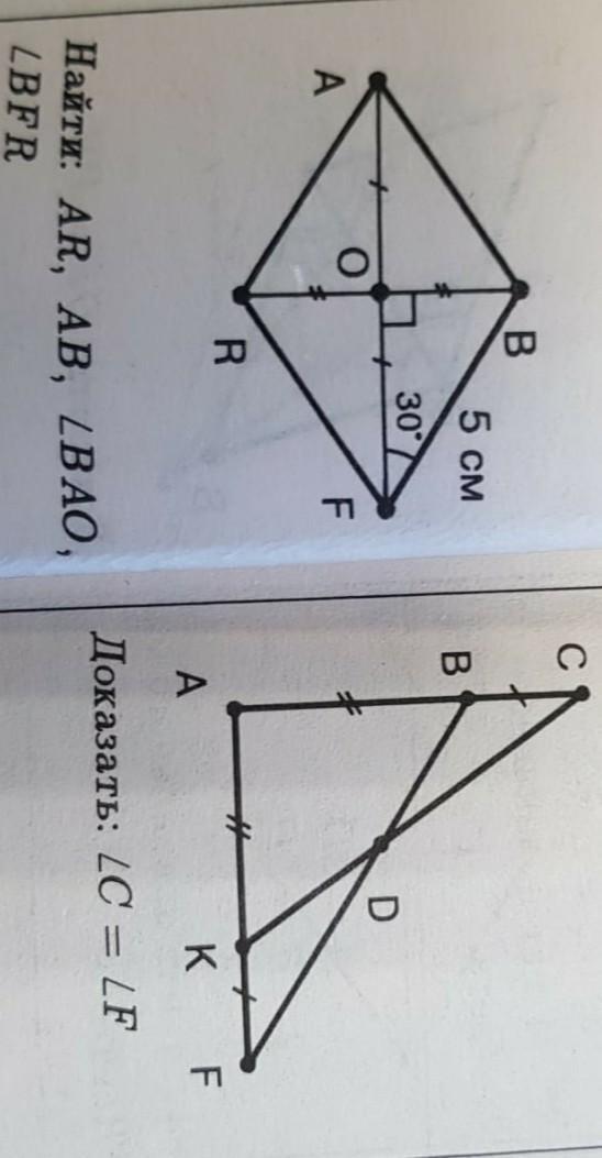 ОТВЕТ AB=AR=FR=BF=5 cm. <ABF=<ARF=120; <BAO=<RAO=30; <BFR=<BAR=60