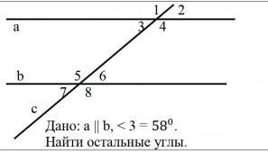 2) угол 4 = 180градусов-угол 3= 180-58=122градуса, так как углы смежные. 3) угол 4 = углу 5, так как они накрест лежащие. 4)угол 1=180градусов-58=122 градуса. 5)угол 2=180- угол 4= 180-122=158 градусов