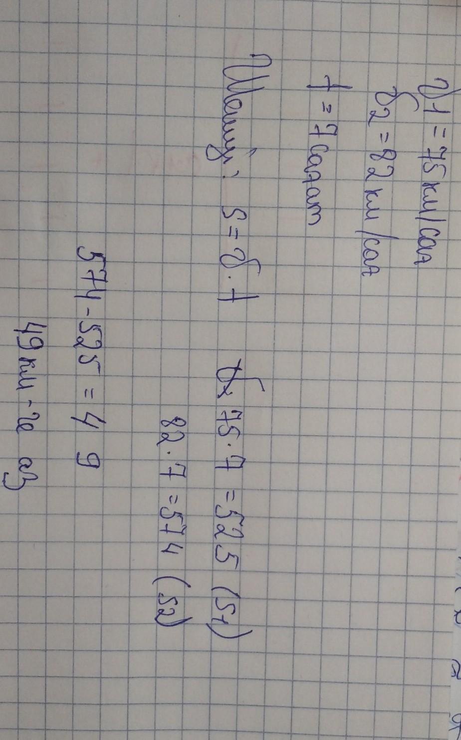 7 сағат ішінде бір автокөлік 75 км\сағ жылдамбықпен, екіншісі 82 км\сағ жыламдықпен жүрді.Бірінші автокөлік жүріп өткен қашықтық нешеге аз?