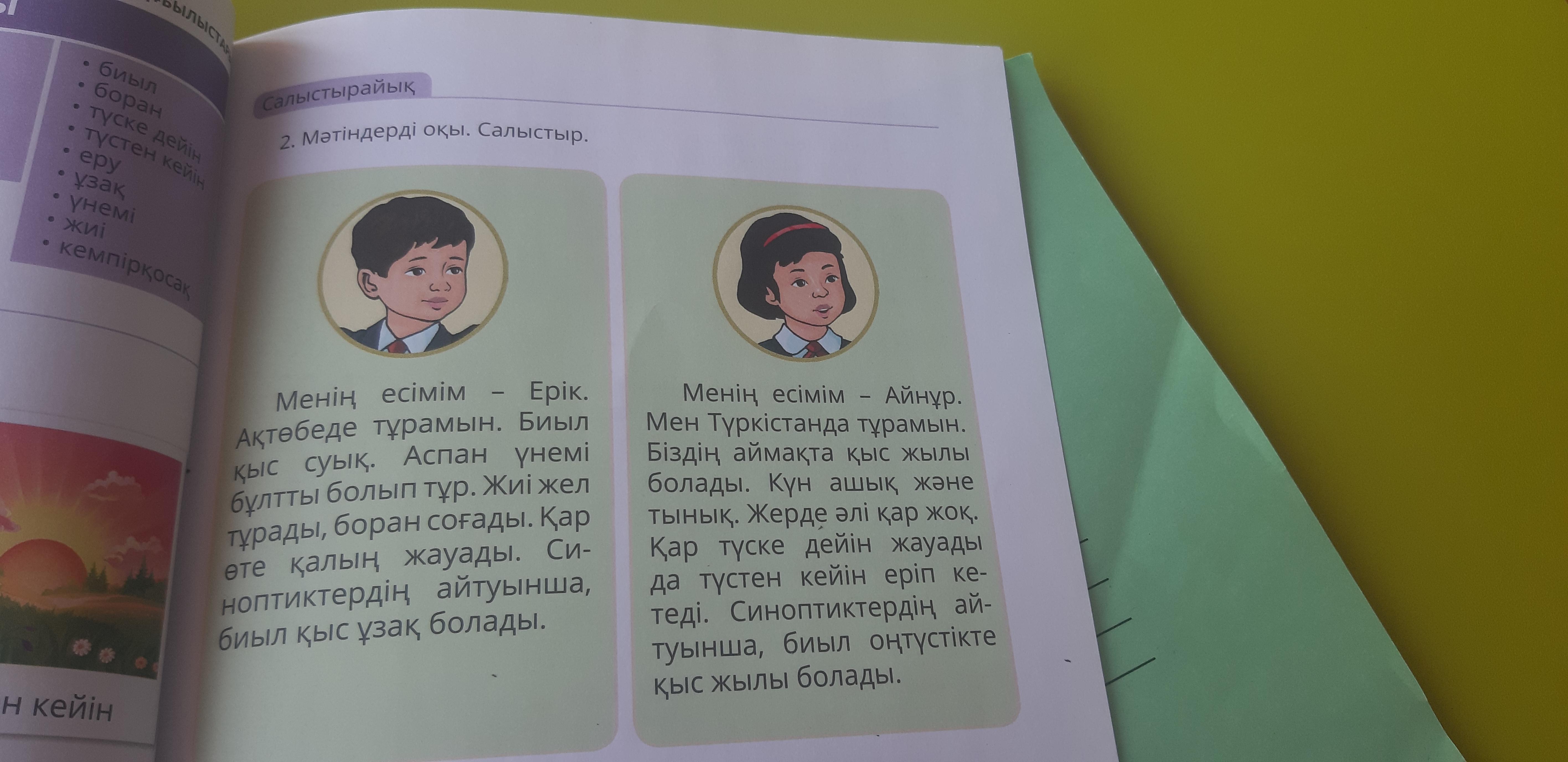 Ответ:салыстыру: бірінші мәтінде Ақтөбенің қысы туралы, және де өте суық болғаны туралы айтылған. Ал екінші мәтінде Айнұр Түркістанда тұратынын және сол жерде жылы қар әлі дұрыс жаумағанын айтып тұр, оның айтуы бойынша синоптиктер оң түстікте биыл жылы болады.