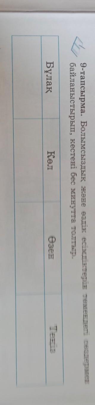 9-тапсырма.болымсыздық және өздік өсімдіктердің төмендегі сөздермен байланыстырып кестені бес минута толтыр