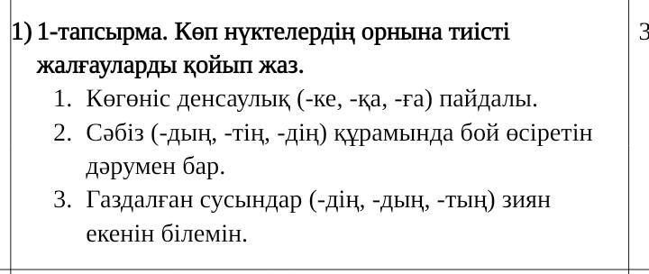 1-тапсырма. Көп нүктелердің орнына тиісті жалғауларды қойып жаз.