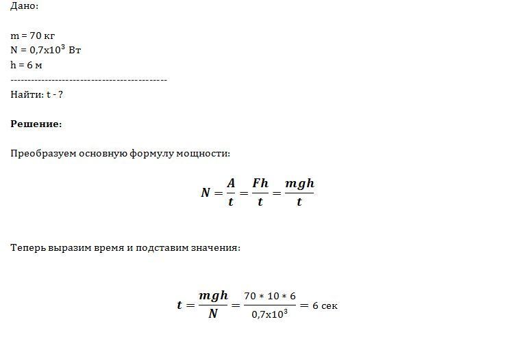 Сколько потребуется времени, чтобы спортсмену массой 70 кг. развивающему мощность 0,7 кВт, подняться по канату длинной 6 м .