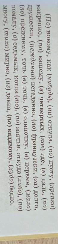 по-вашему,в четвертых,кое-где,вдаль, по-дружески,нежданно-негаданно,по-французски,задолго,по-прежнему,точь-в-точь,в одиночку,впервые,мало-помалу,в седьмых,когда-то,по-заячьи,откуда-либо,помногу,тихо-мирно,издавна,по-видимому,худо-бедно