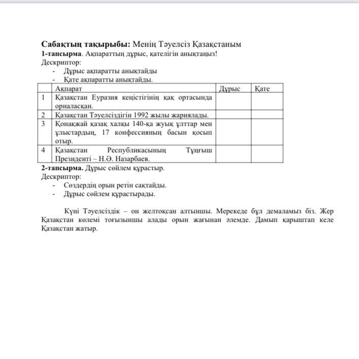 Тәуелсіздік күні- он алтыншы желтоқсанда. Бұл мерекеде біз демаламыз. Қазақстан жер көлемі жағынан әлемде тоғызыншы орын алады. Қазақстан дамып қарыштап келе жатыр.