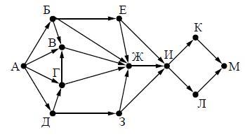 Рассмотрите граф и определите количество путей из города А в город М, проходящих через город Ж, и не проходящих через город Л.