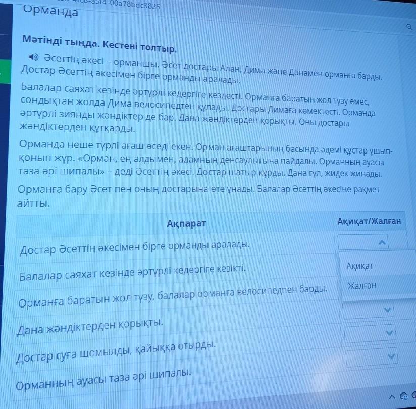 4) Әсеттің әкесі — орманшы. Әсет достары Алан, Дима және Данамен орманға барды.