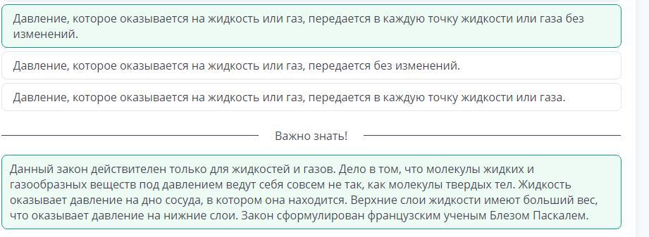 Давление которое оказывается на жидкость или газ передаеться в кажду точку жидкости или газа без изменений