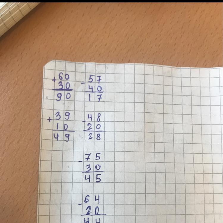 Запишите в один столбик примеры на сложение, а в другой на вычитание и решите их: 57 - 40 60 + 30 39 + 10 48 - 20 75 - 30 64 - 20