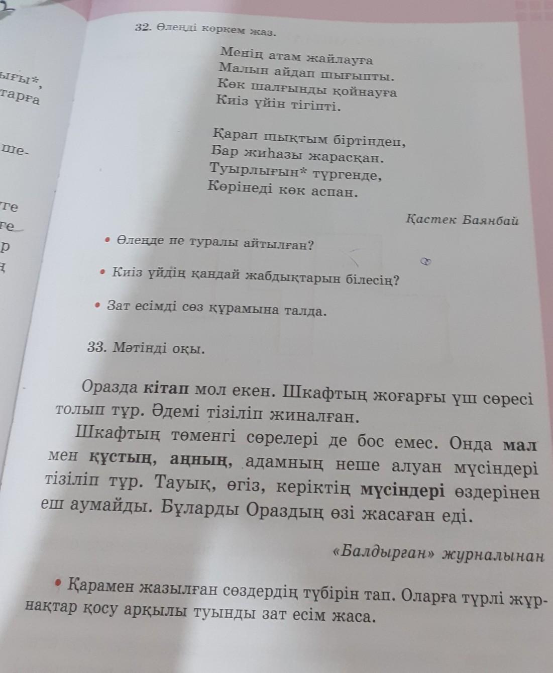 3)Атам-зат есім,Жайлауға-Жайлау-зат есім,ға септік жалғауы, шалғынды-шалғын зат есім,ды жедел өткен шақ,Туырлығын -туырлық зат есім ғын-жіктік жалғау