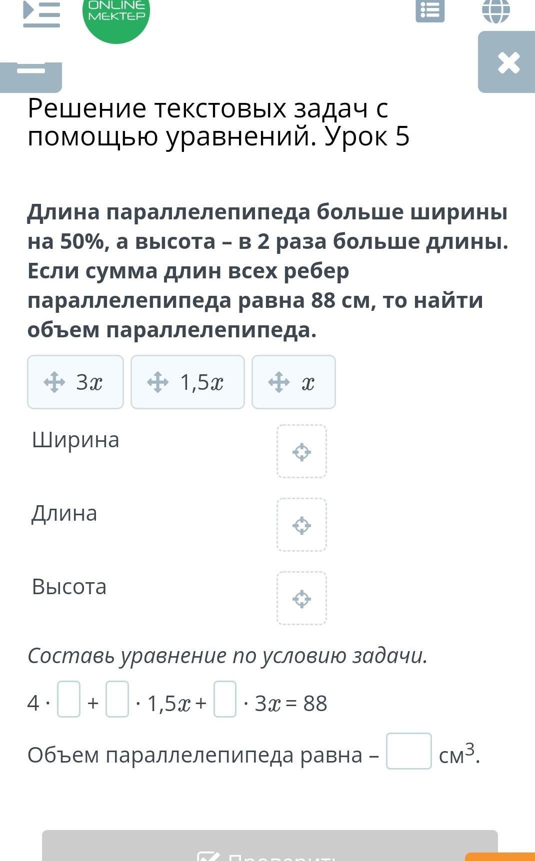 Ширина-x Длина-1,5x Высота-3x 4×x+4×1,5x+4×3x=88 Обьём=288³