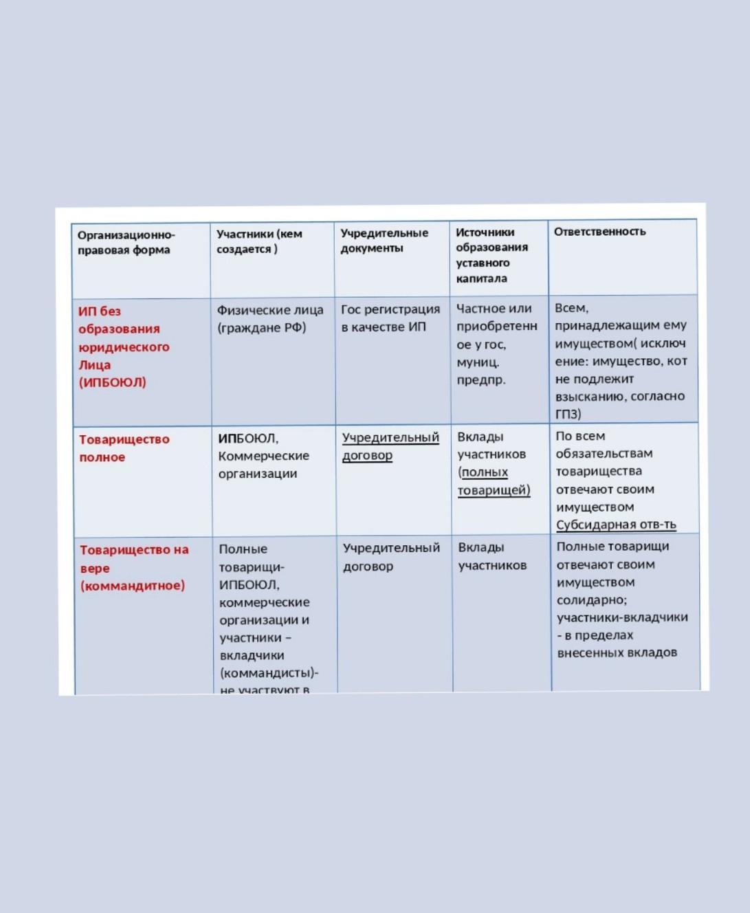 Напишите сравнительную таблицу по организационнно- правовым формам юридических лиц, используя нормы Гражданского кодекса РФ.