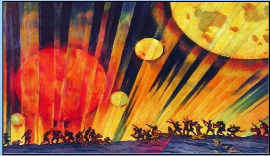 Константин Юон – автор картины «Новая планета». Создал он ее в 1921 году, когда в России только закончилась гражданская война. Страна переходила к мирной жизни.