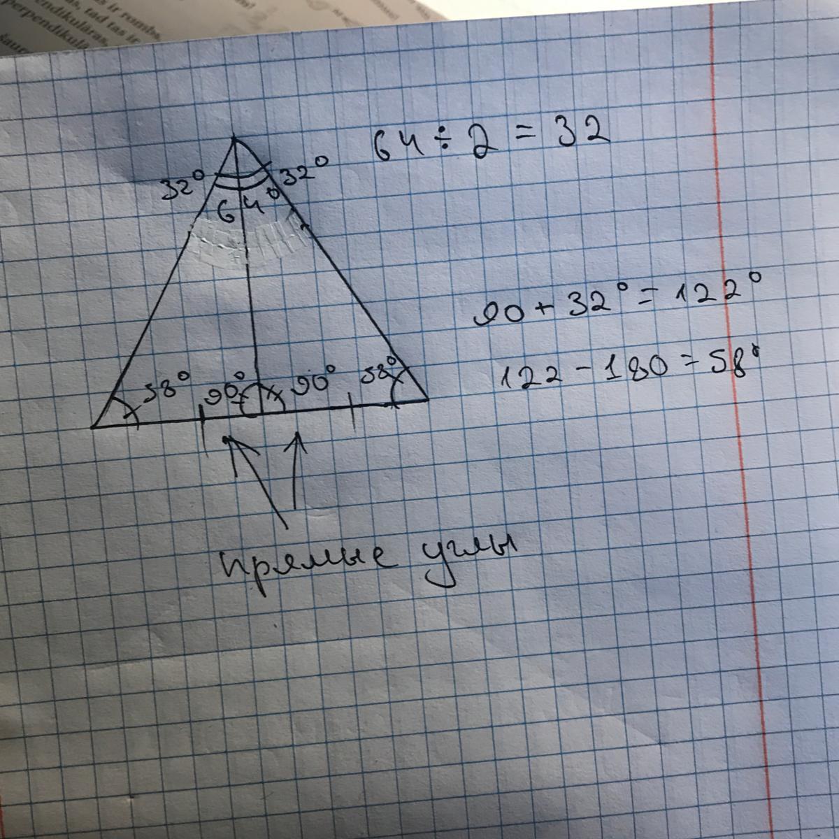 В равнобедренном треугольнике угол вершины равен 64°. Найди угол других вершин, образующийся между биссектрисой и стороной треугольника.