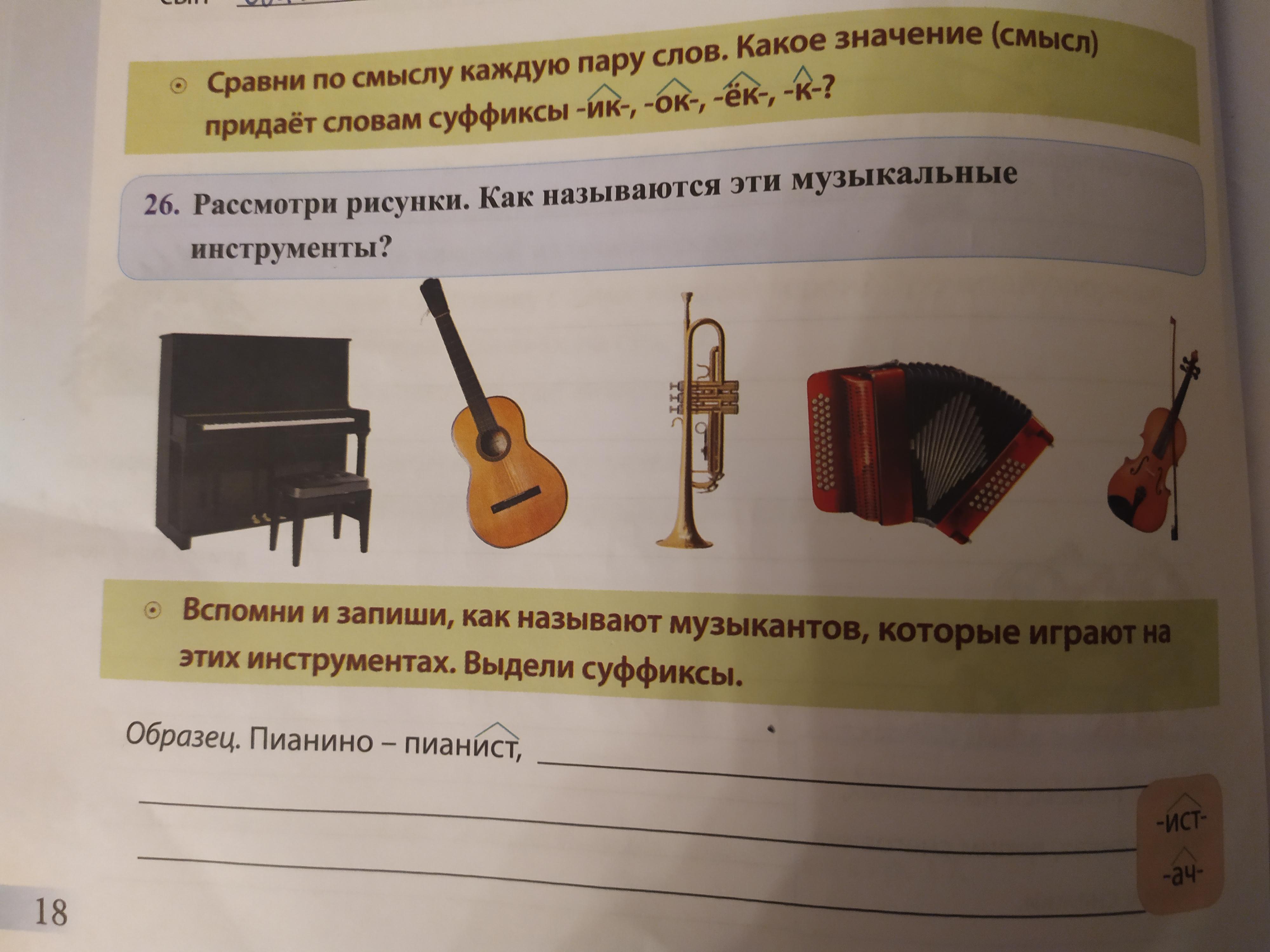 гитарист - суффикс ист, трубач - суффикс ач, баянист - суффикс ист, скрипач - суффикс ач