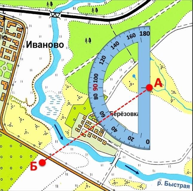 Определите азимут по плану местности из точки А на точку Б с помощью транспортира, учитывая, то что точка Бнаходится западнее точки А: